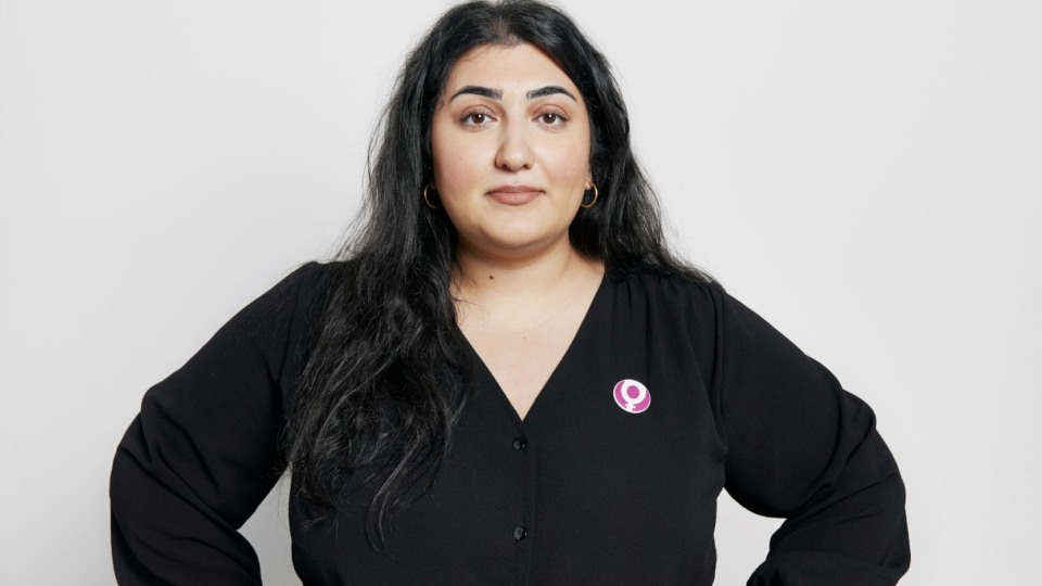Roks ordförande Adine Samadi med armarna i kors framför en vit bakgrund